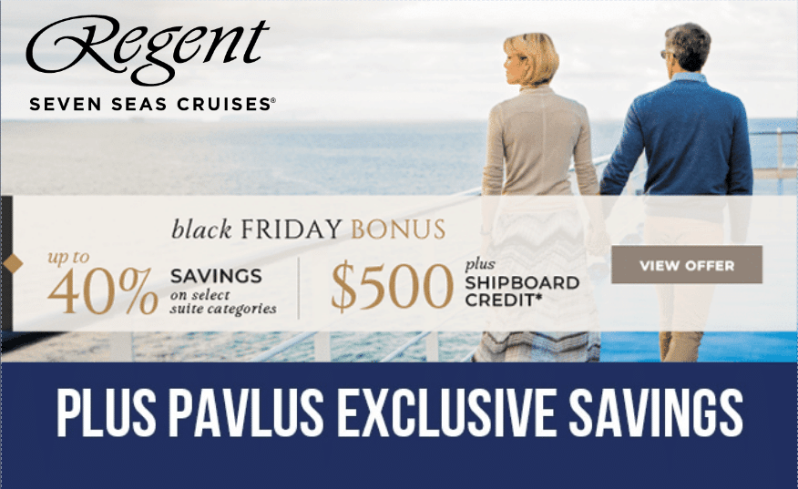 The Black Friday Bonus Offer is here with up to 45% Savings & $500 Shipboard Credits on select sailings now! Ask your travel planner about Pavlus Exclusive Unadvertised fares! Preview the NEW 2026/2027 Collection here! We have a low price guarantee for every Regent Cruise including World Cruises.