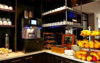 - Self-serve beverage station with complimentary tea, hot chocolate & premium coffees, including decaf options