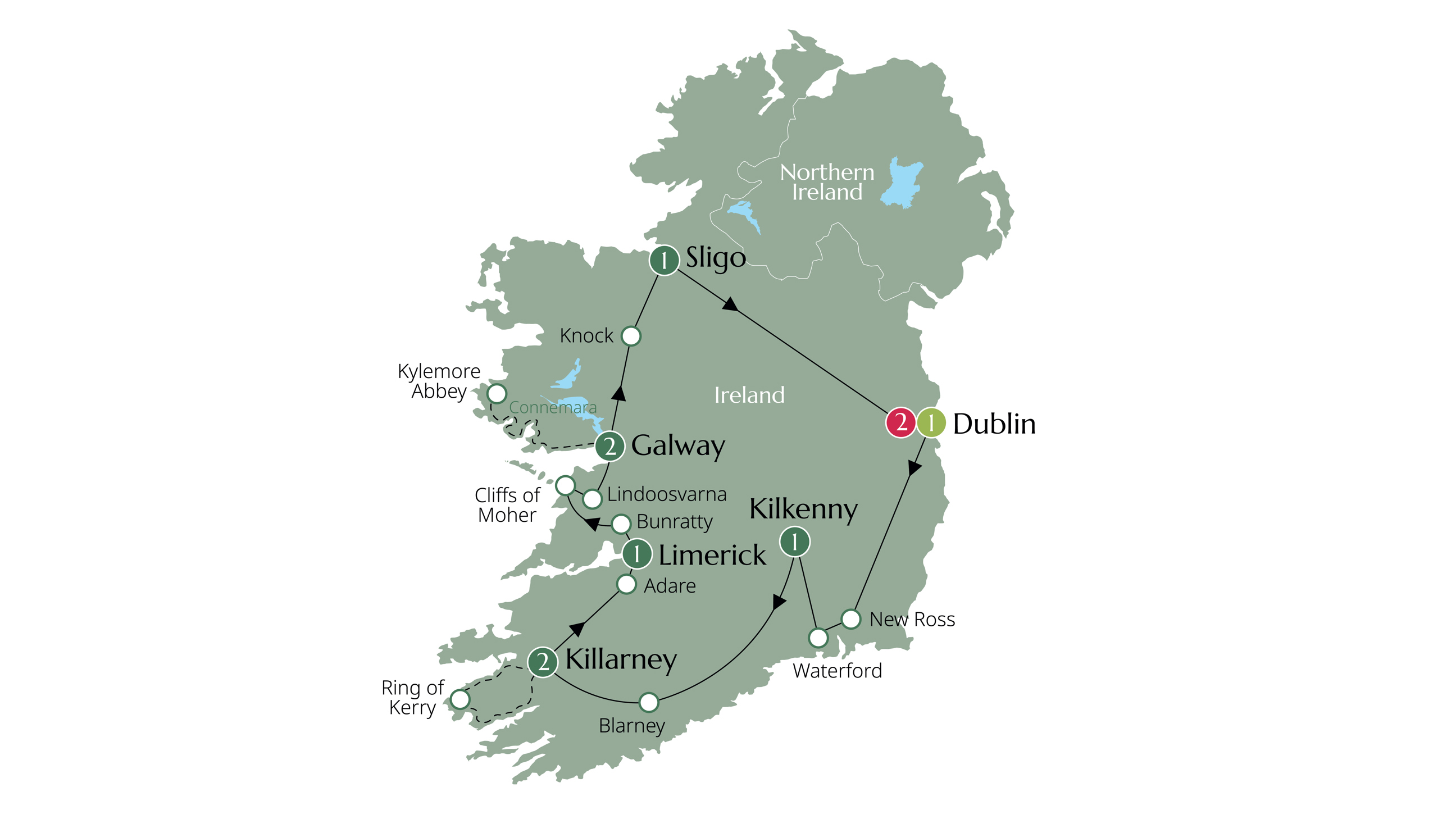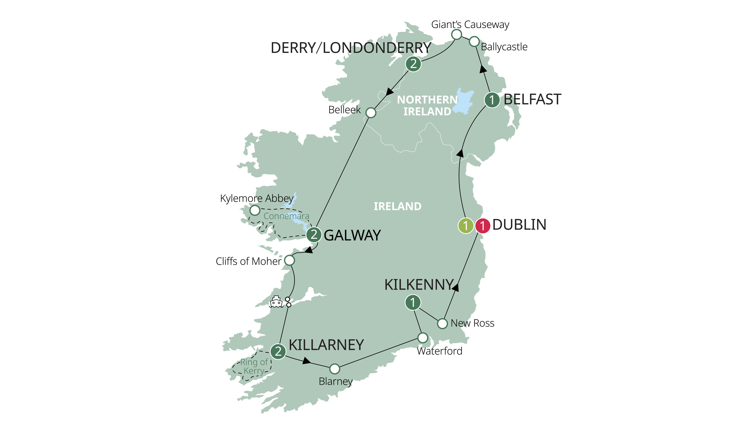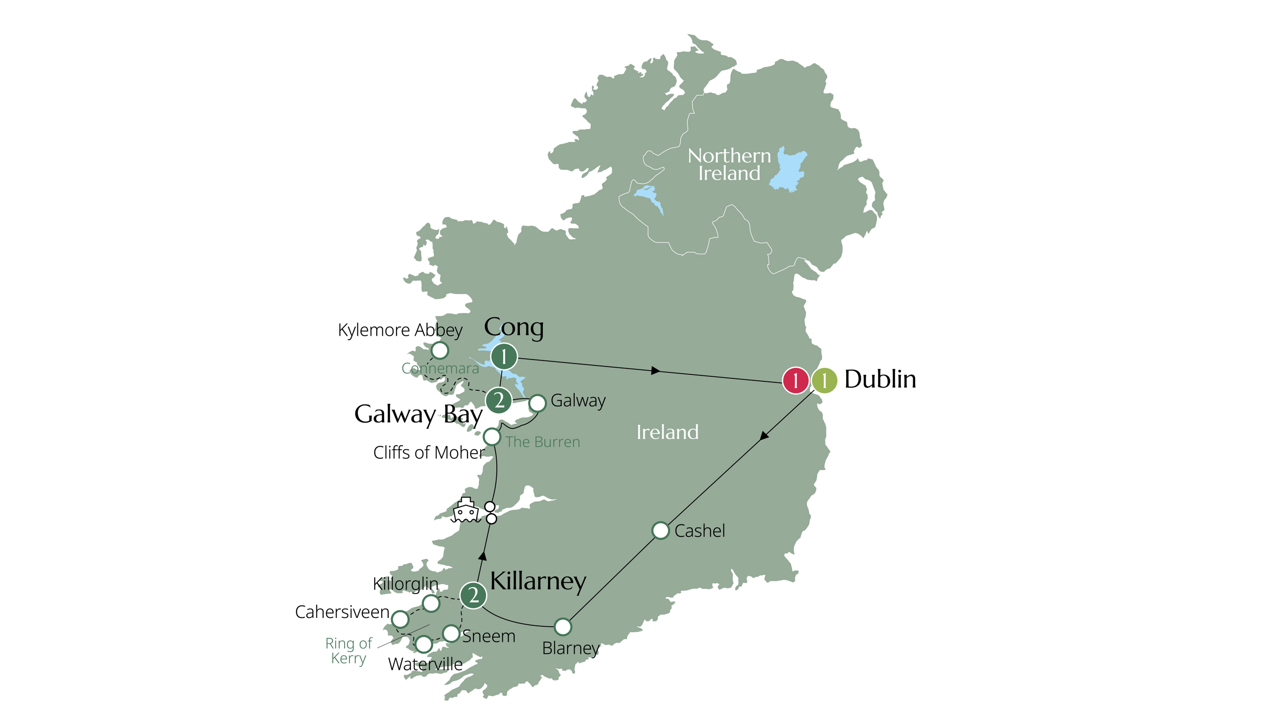 Discover Ireland’s legendary landscapes and enduring traditions on this 10-day journey through the country’s most celebrated regions. From Georgian squares in Dublin to the windswept shores of Connemara, experience ancient sites, historic estates and vibrant cities. Walk along the Cliffs of Moher, travel the Ring of Kerry and enjoy an enriching MAKE TRAVEL MATTER® Experience at Powerscourt Gardens. Visit Kylemore Abbey, cruise Lough Corrib and explore monastic ruins, film locations and castles that tell Ireland’s layered story. |
