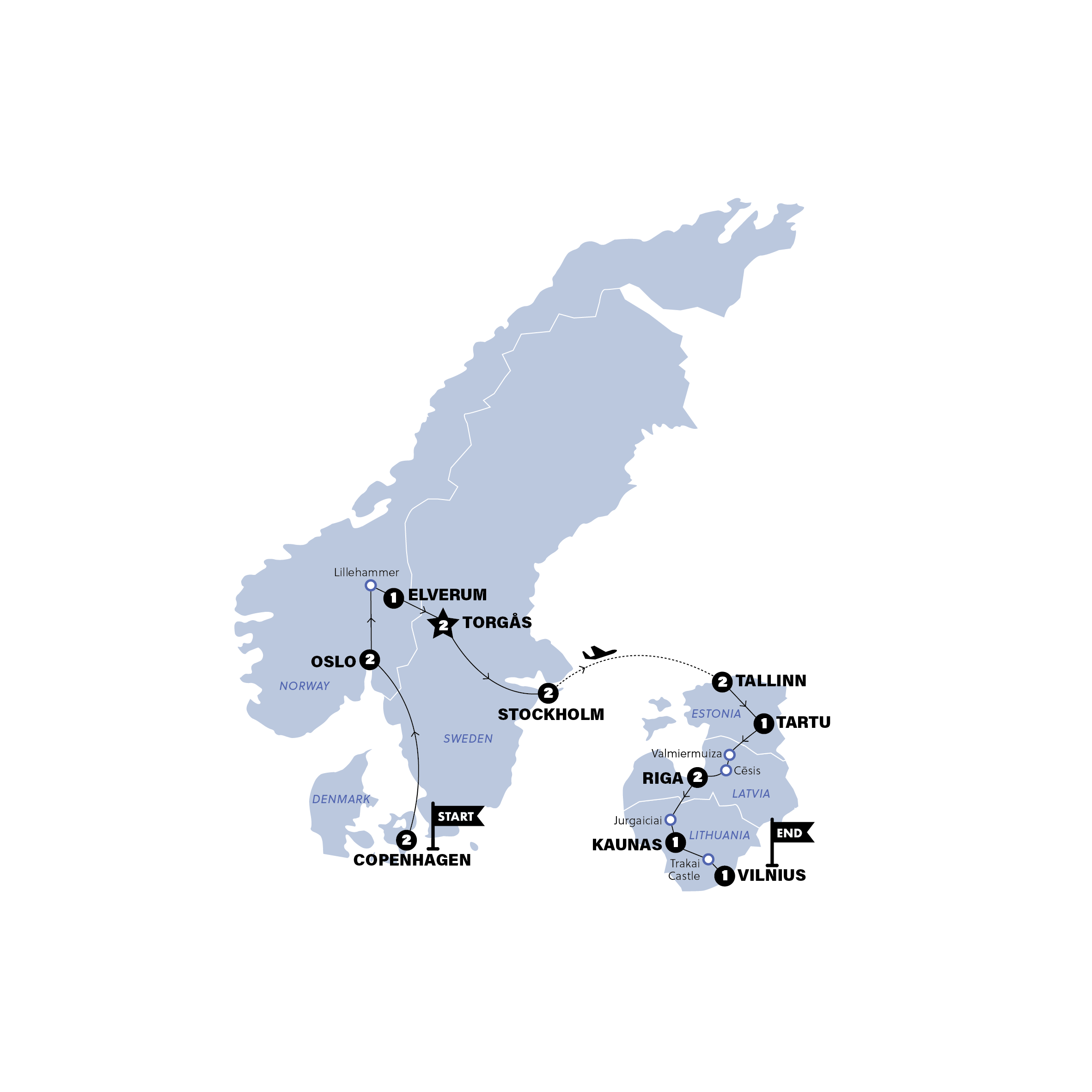This epic 19 day adventure brings you the spectacular summery sights of Scandinavia and the best bits of the Baltics. From colourful Copenhagen through to the adventure capital of Voss, the Geiranger Fjord and elegant Stockholm, you'll fall in love with everything you see in Scandinavia. But we're not done there - we'll then hop on a speedy flight to Estonia to explore the gothic beauty of the Baltics, from breweries to Baroque architecture. |