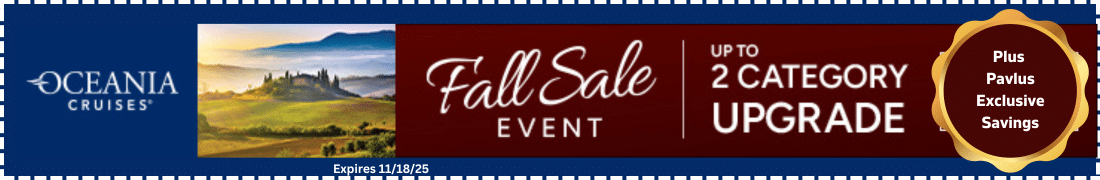 *Offers and fares are subject to change or withdrawal without prior notice. Flash Sale is valid 7/1/25-7/15/25. Up to 2 Category Upgrade and savings of up to 40% offers are available for select categories on select sailings, subject to change and capacity controlled. Number of categories upgraded varies based on cruise and category booked. Mention Code HOID. Shipboard Credit in an amount up to US$1,600 varies by voyage length and is per stateroom. Visit www.OceaniaCruises.com for current pricing. All fares are per person in U.S. dollars, valid for residents of United States and Canada, based on double occupancy (unless otherwise noted) – except fares for Solo category are for a single traveler and are based on single occupancy – for new bookings only and may be withdrawn at any time. Unlimited WiFi amenity does not include streaming and includes a login for the first two devices per stateroom (one login for solo traveler). Visit OceaniaCruises.com/internet for more details. Fares are based on published Full/Brochure Fares; such fares do not include optional charges as detailed in the Guest Ticket Contract, which may be viewed, along with additional terms, at www.OceaniaCruises.com. All cruise fares include gratuities for stateroom/suite attendants, butlers and dining waitstaff, as well as government taxes and fees. Additional gratuities apply to any other services or purchases made onboard which will incur a service gratuity of 20%. Not all promotions are combinable. We may collect, use, share and secure your personal data as described in our privacy policy, which is available on our website at OceaniaCruises.com/legal/privacy-policy. Oceania Cruises reserves the right to correct errors or omissions and to change any and all fares, fees, promotions and surcharges at any time. Ships’ Registry: Marshall Islands.