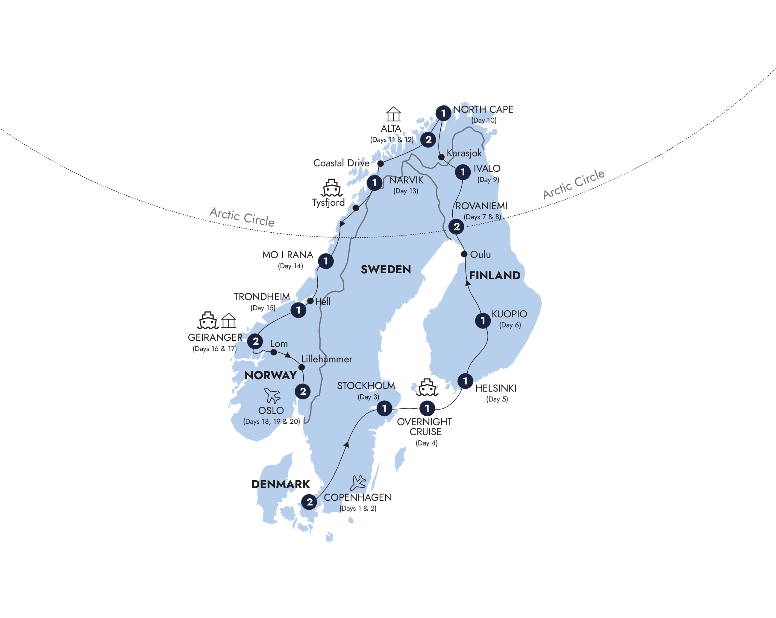 Cruise the Baltic Sea to Helsinki, step back in time to the reign of the Vikings in Oslo and see Hans Christian Andersen's Little Mermaid in Copenhagen, on a grand three week tour. At North Cape, toast the midnight sun with champagne and local caviar alongside the towering cliffs of Europe’s most northern point, where the summer sun never sets. Sample local specialties like liquorice and smoked reindeer at the harborside Helsinki Food Market before arriving to the Swedish capital of Stockholm, home to the melodies of the ABBA Museum and the magnificent Vasa Galleon. After voyaging across the home territories of the nomadic Sami community in Lapland, visit the farm of Trine Lyrek where you’ll meet her Arctic dogsled racing Alta huskies. Draw your vacation to a close among Oslo’s thousand-year-old Viking ships. |