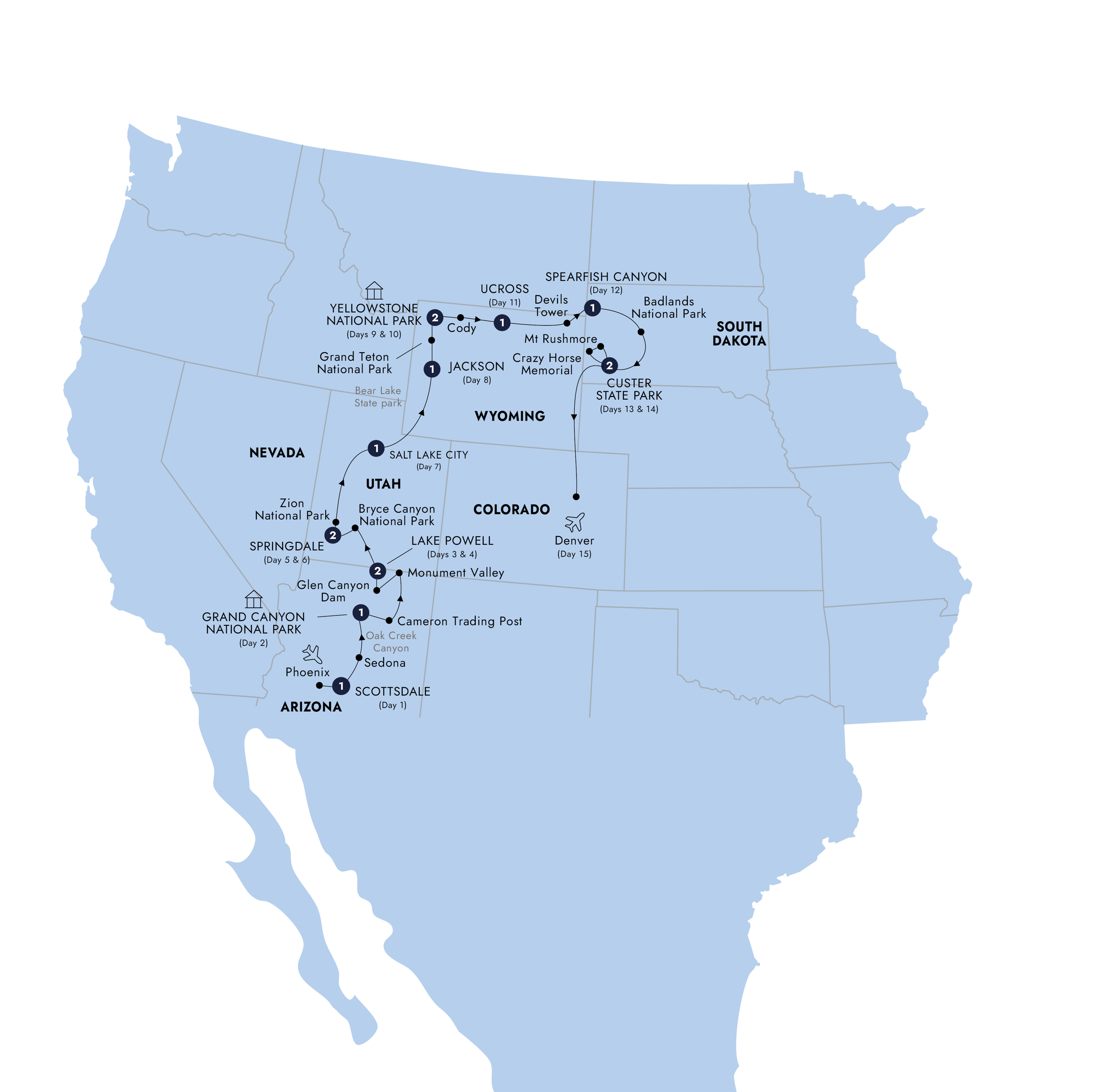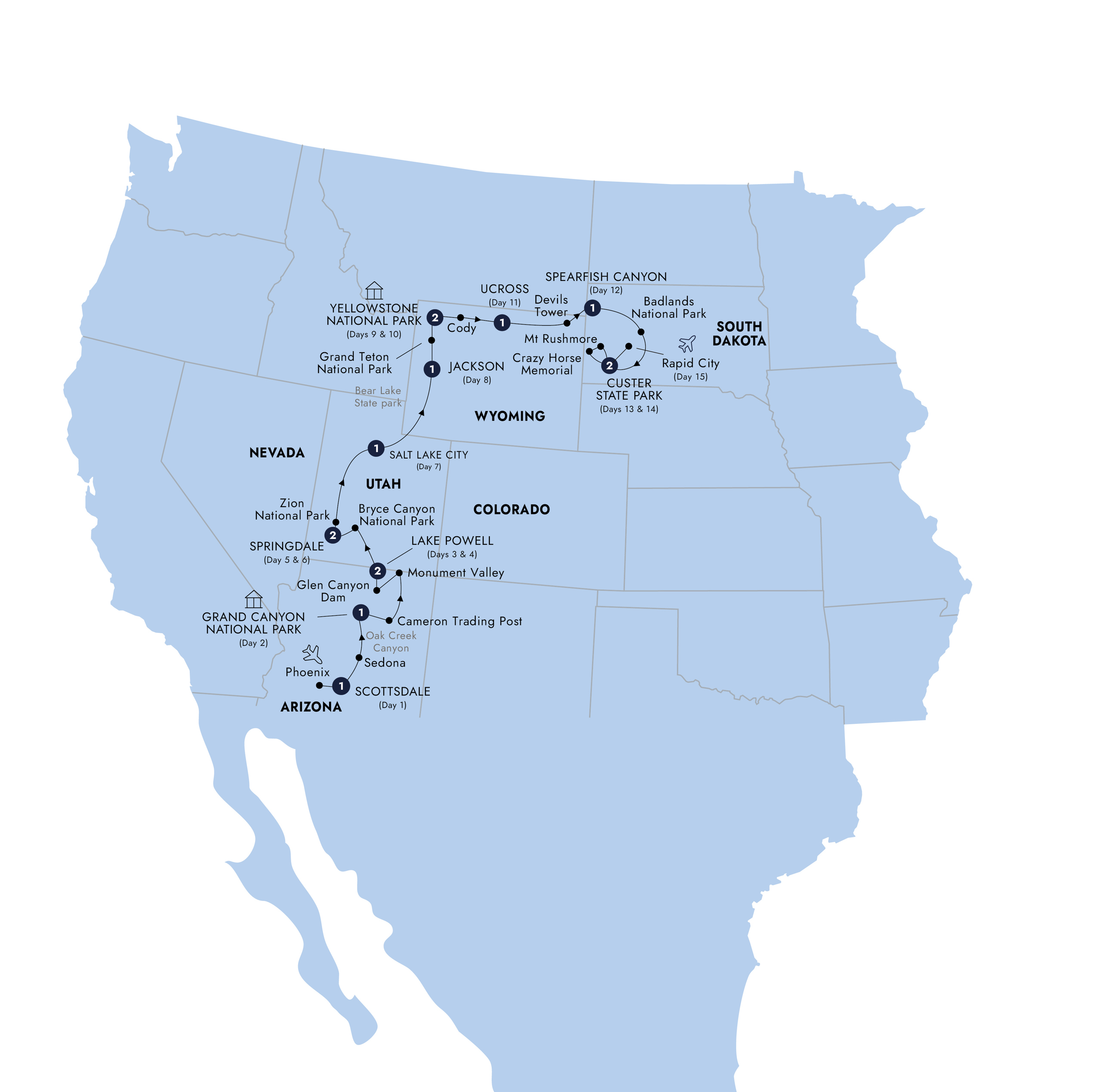 | America's Magnificent National Parks - end Rapid City, Small Group  Explore America's top national parks on this 15-Day guided tour. After an evening in Scottsdale, start your journey in bohemian Sedona, where spiritual seekers and nature lovers alike will revel in its red-hued mountainous landscape. Take a short jaunt to the Grand Canyon, where a Local Expert will show you the wonders of America’s most famed natural beauty. In Monument Valley Navajo Tribal Park, Make Travel Matter and board all-terrain vehicles and ride through the desert with your Navajo guide. Glide through Zion National Park on a private shuttle, before watching the red cliffs and valleys give way to the Rocky Mountains of Grand Teton and Yellowstone. Finally, scale the 563-foot-tall Crazy Horse Memorial and stand face-to-face with the stone carving of the Lakota warrior. |