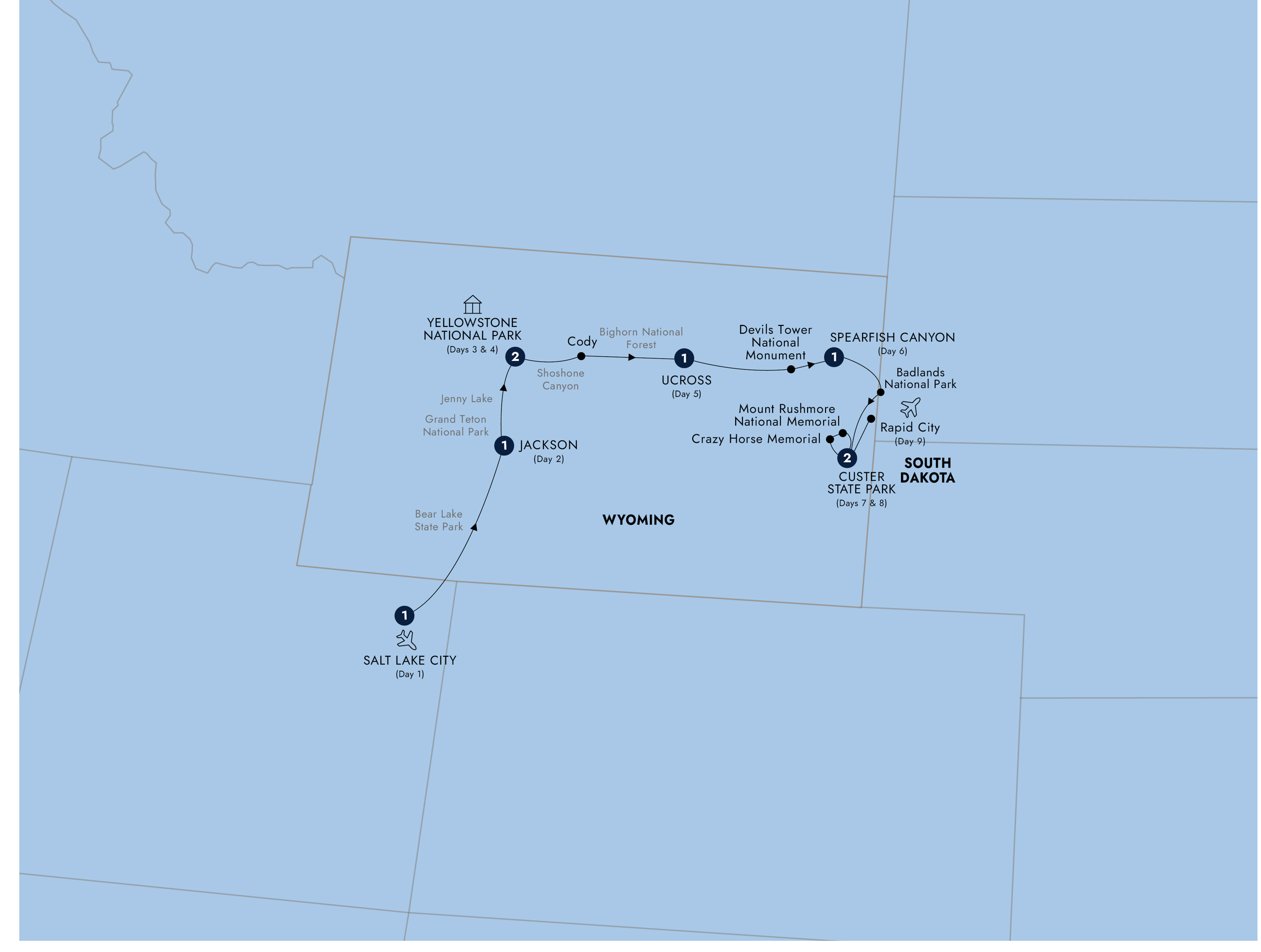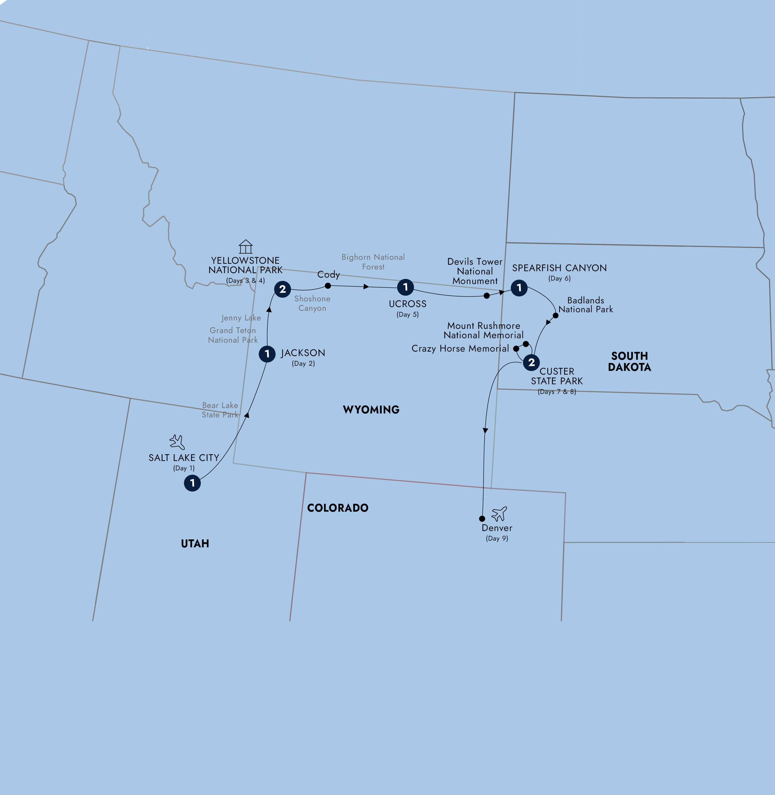 | American Parks Trail - End Rapid City, Small Group  Experience the rugged and wild West during this 9-Day tour. Start in Salt Lake City, and then head to Jackson & the Grand Tetons. The adventure continues to Yellowstone National Park where you will walk beside the rainbow-hued hot springs and watch Old Faithful spew water more than 120 feet into the air. In Cody, see a firearms collection at the Buffalo Bill Center. Travel to Devils Tower, a butte of igneous rock jutting from the craggy Black Hills mountains. Here, you will also learn about the Western legends Wild Bill Hickok and Calamity Jane. Then head to Mount Rushmore National Memorial, where the visages of Presidents Washington, Jefferson, Lincoln and Roosevelt are carved into the mountainside. And ascend 563 feet to the top of Crazy Horse Memorial, named for the Lakota warrior, and stand face-to-face with the world’s largest mountain carving. |