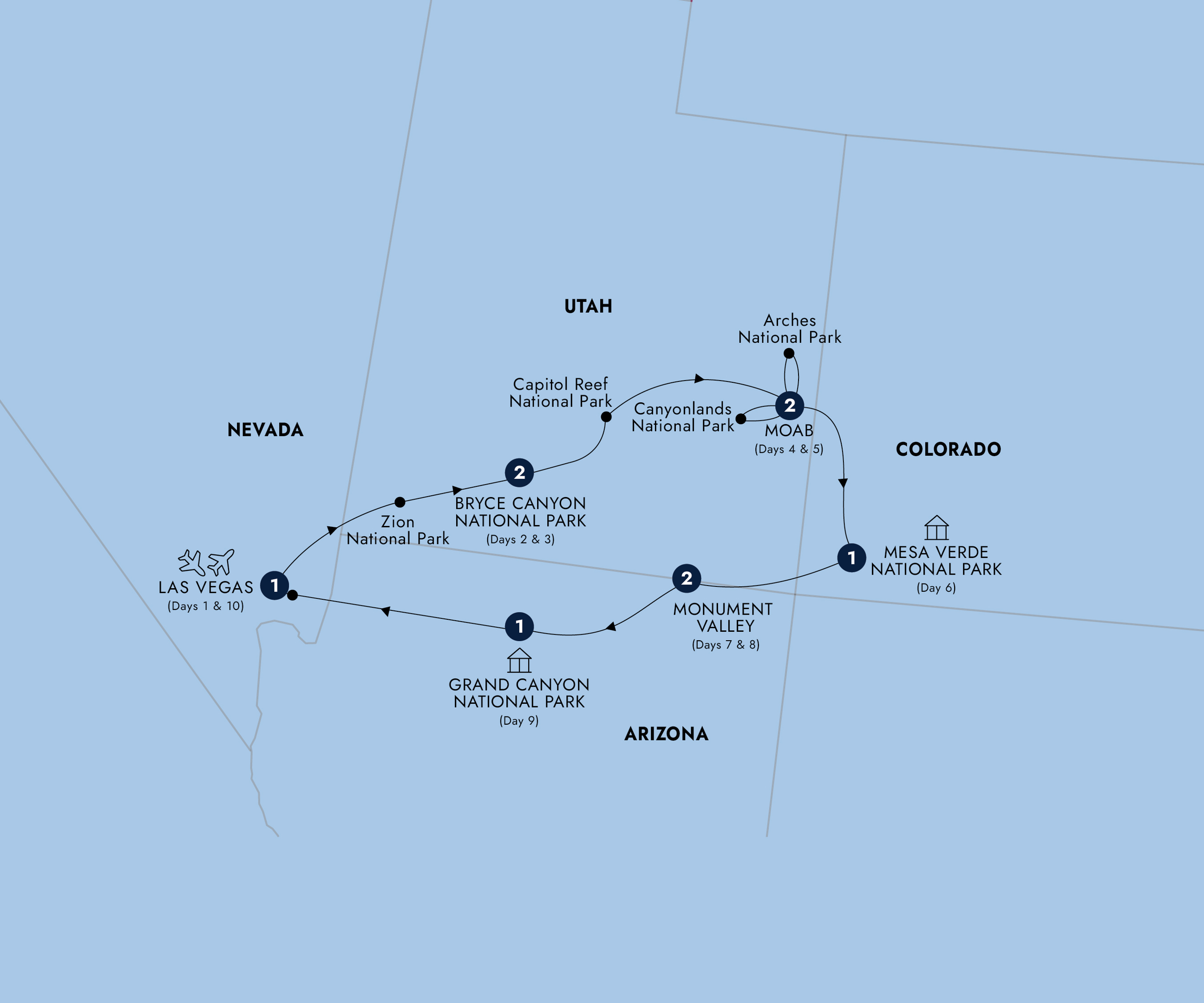 | Wonders of the American West - Small Group  See the best of the American West on this 10-Day guided tour. Travel to Bryce Canyon National Park to explore its rock pillars and natural amphitheatres, then feast with your fellow travelers overlooking the park’s iconic orange rock formations. In Moab, see the ancient pueblo dwellings in Mesa Verde National Park, where the Ancestral Pueblo people once lived. Meet a Navajo guide in Monument Valley Navajo Tribal Park, where you will board ATVs, explore the valley and learn about the tribe’s history. Later, eat a traditional Navajo meal amid the valley’s beautiful buttes and mesas. Then go off the beaten path into backcountry with your Navajo Guide. Join a Local Expert at Grand Canyon National Park for a one-of-a-kind experience: allow the expert to guide you through the park while teaching you about how this national treasure was formed. |