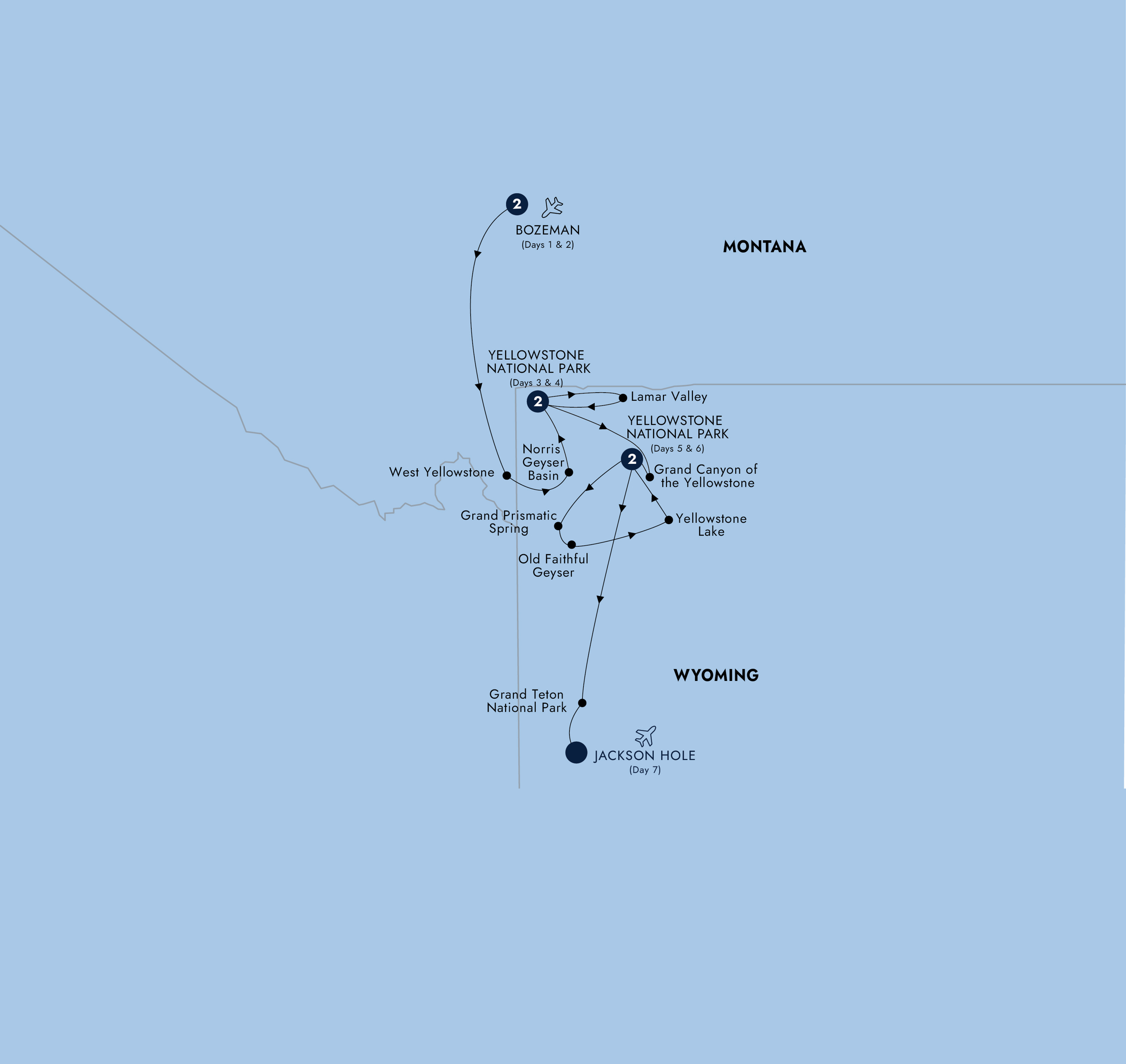 | Yellowstone Discovery  Venture into Wyoming's outstanding national parks, Yellowstone and Grand Teton. You'll enjoy breath-taking natural beauty, mountains, geysers, wildlife watching and the fresh open air. Your adventure starts in Bozeman, before you embark on a four-day voyage into the magnificent Yellowstone National Park, the most in-depth exploration that we offer. See famous geysers and hot springs, view wildlife, discover the land with a Local Expert and explore downtown Bozeman. |