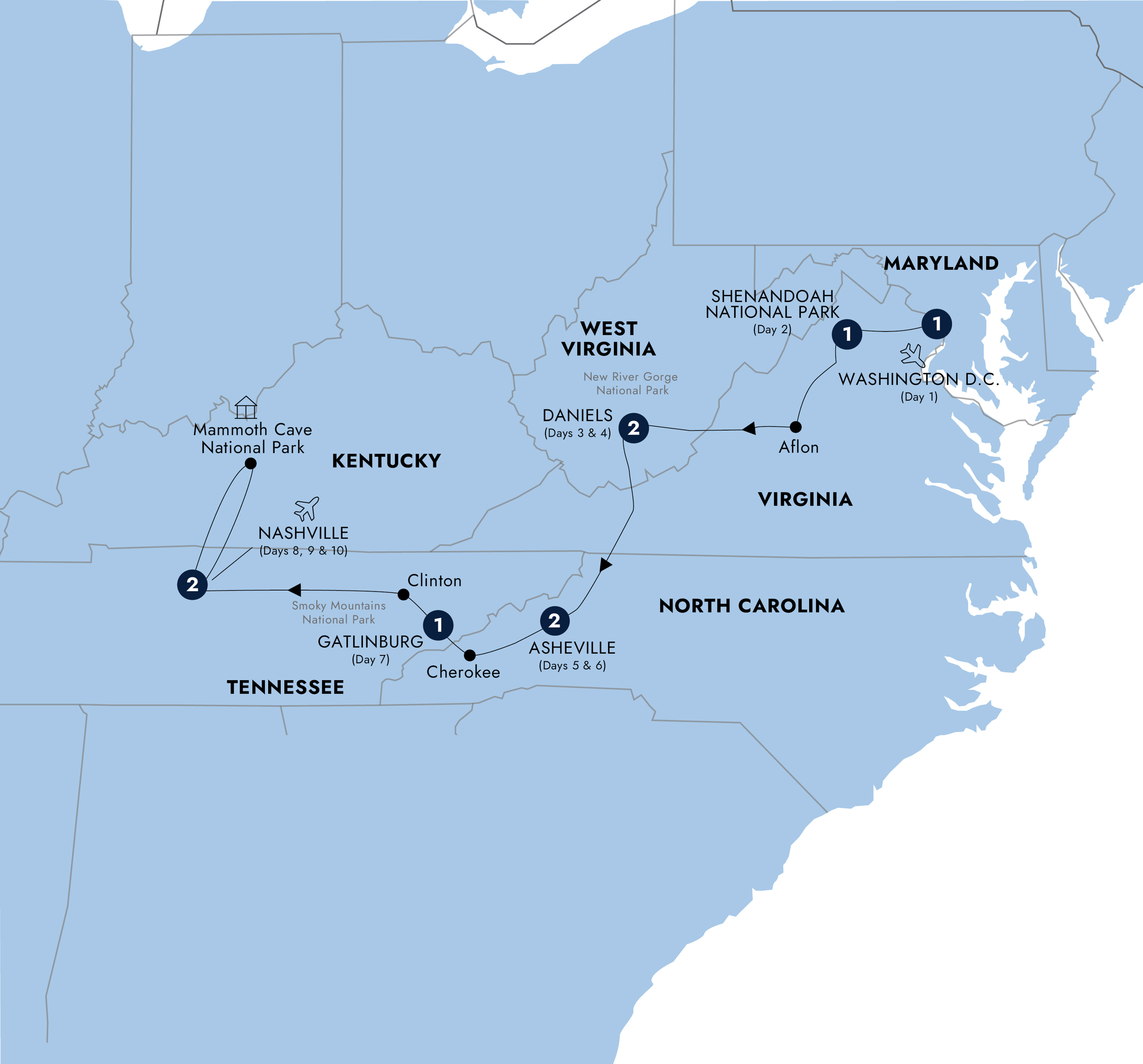| Spectacular National Parks of Eastern USA  Discover the spectacular National Parks and eclectic cities of the Eastern USA on this 10-Day guided tour. Revel in wide open spaces, stunning landscapes, iconic city sights and enjoy a bounty of food, music and art. Starting in Washington D.C., enjoy the spectacular colors of Shenandoah National Park, taste signature wines at the Veritas Winery and reconnect with nature at New River Gorge National Park in West Virginia, America’s newest National Park. Take a behind-the-scenes tour of Citizen Vinyl Record’s press factory in Asheville, and explore the vast Biltmore Estate, America's largest privately owned home. Uncover the region’s fascinating history at the Oconaluftee Indian Village as you join a Cherokee cultural expert for a MAKE TRAVEL MATTER® Experience. Picnic in the Great Smoky Mountains National Park and explore the intricate caves of Mammoth Cave National Park, ending your trip with a crescendo in Nashville, the toe-tapping home of country music. |