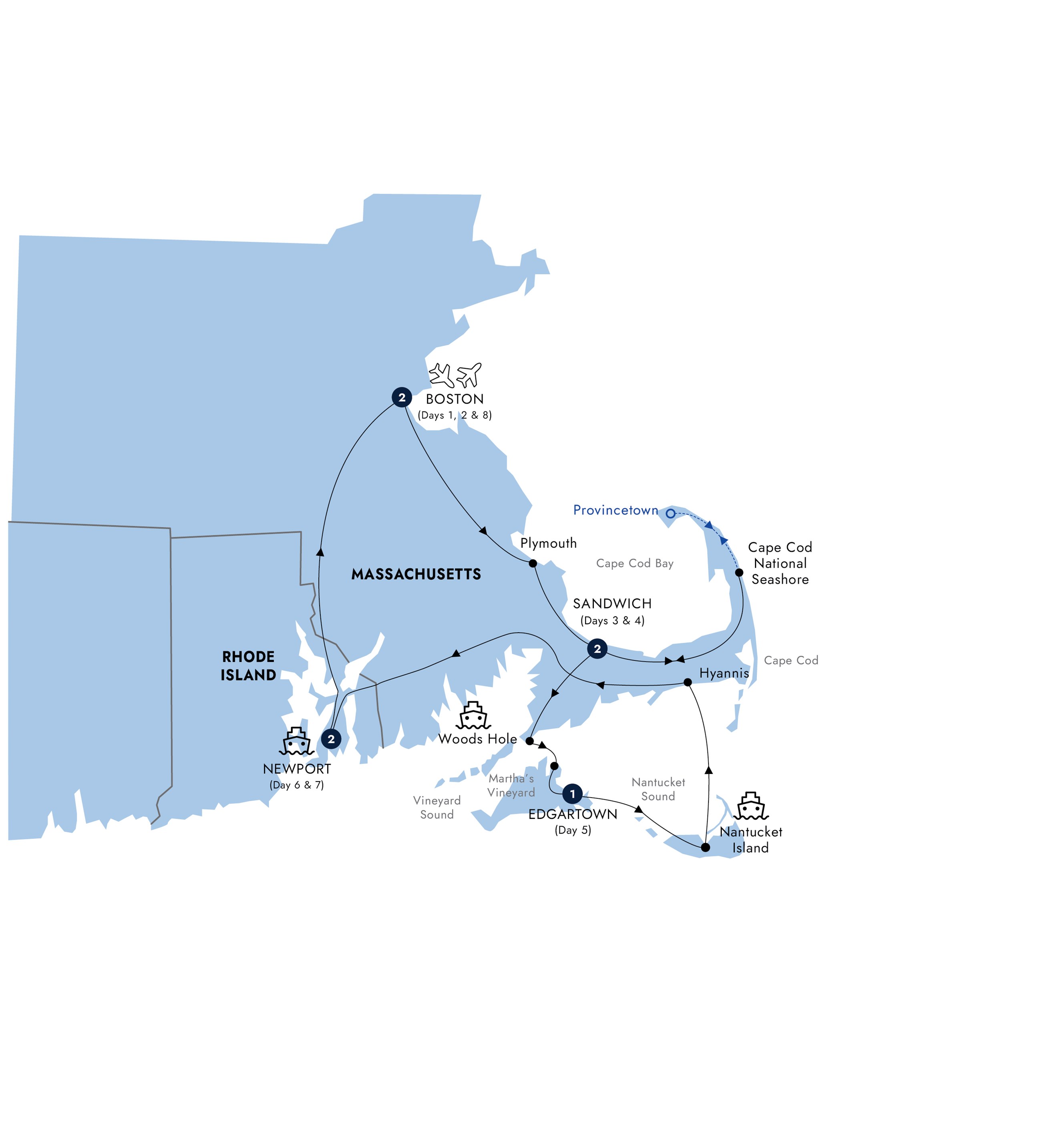 | Treasures of Cape Cod & the Islands - Small Group  This 8-Day guided tour blends history with glamour as you travel from Massachusetts to Rhode Island. Follow the red-brick Freedom Trail in Boston to see where the U.S. took shape. On the shores of Cape Cod Bay, see Plymouth, a coastal town famous for its rich history as the landing site of the Pilgrims in 1620; visit the living history museum at Plimoth Patuxet. At Martha's Vineyard, a driver will take you past the former home of Jacqueline Kennedy Onassis and to Oak Bluffs, an idyllic town with gingerbread-like cottages. Indulge in a sea-to-table feast filled with fish caught from local fishermen, fresh produce from nearby farms and delicacies picked by foragers. In the seaside city of Newport, board an 80-foot schooner to cruise the coastline, taking in views of historical buildings and the homes of the rich and famous — and learn about the area’s past as a pirates’ haven. |