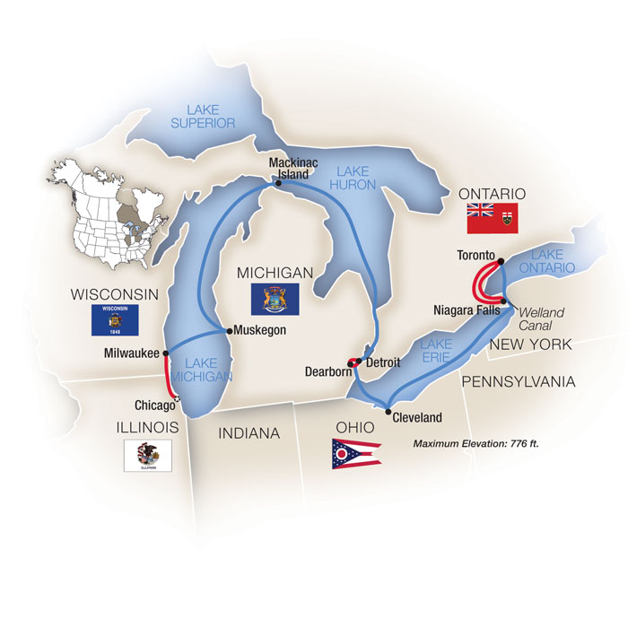 | Cruising the Great Lakes:  Toronto to Chicago - Westbound  The mighty Great Lakes have played a vital role in the history and cultural fabric of North America for centuries... explore their storied waters... and unique cities and towns... that have grown along their shores... Enjoy a 7-night Great Lakes cruise between Chicago and Toronto aboard a beautiful Ponant yacht, plus two-night stays at your choice of premium hotels in these two great anchor cities. You'll sail through Lakes Ontario, Erie, Huron and Michigan, calling on destinations including Detroit, Mackinac Island, Cleveland and more. Explore urban planning and revitalization in a re-emerging Detroit; celebrate American invention and ingenuity at The Henry Ford in Dearborn;  enjoy lunch at Mackinac Island's Grand Hotel; ride a dune buggy along the Lake Michigan shore; sample Holland, Michigan's Dutch heritage, tulips and beer culture; experience an architectural cruise, a taste of Chicago in America's "Second City," and much more!