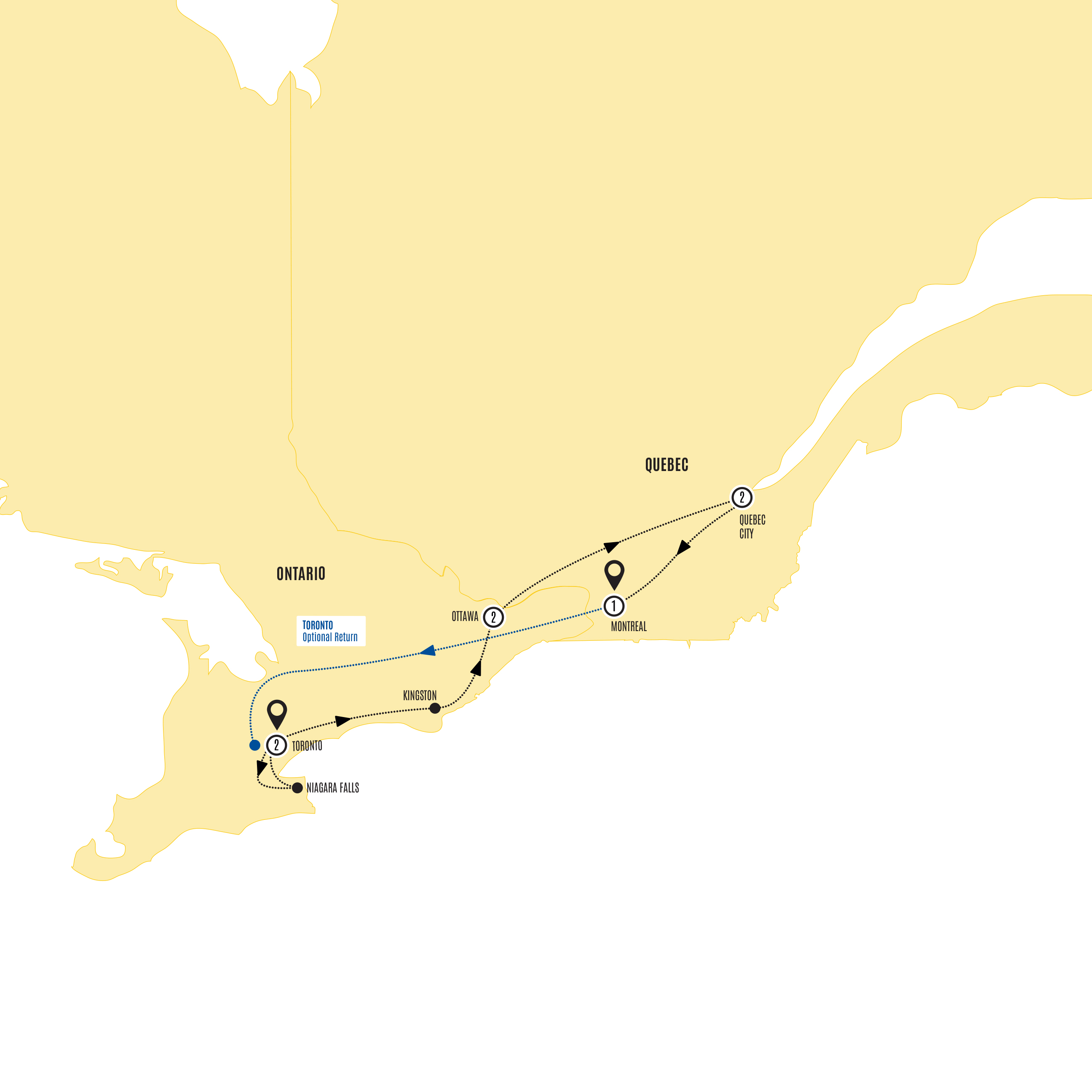 | Historic Cities of Eastern Canada 2026 - 9 Day Tour from Toronto to Montreal  This lovely tour of Eastern Canada unlocks the brightest sights from the thundering falls to quaint Québec City. Cinch your poncho hood tightly for a thrilling boat cruise to the magnificent Horseshoe Falls before immersing yourself in the varied cityscapes of Toronto, Ottawa, Montréal, and Québec City. With guided sightseeing in each, this encompassing tour of Eastern Canada makes it easy to compare the diverse flavors of the region – especially with an included lofty lunch at Toronto’s soaring CN Tower, local icewine with dinner at picturesque Niagara Falls, a scenic cruise around the rugged Thousand Islands, a classic French dinner in Old Town Québec, and breakfast in a traditional sugar shack. A must-have beavertail pastry in the capital city of Ottawa is just as sweet. PLUS, your tour includes your choice of excursions in Ottawa so you can plan your day your way. |