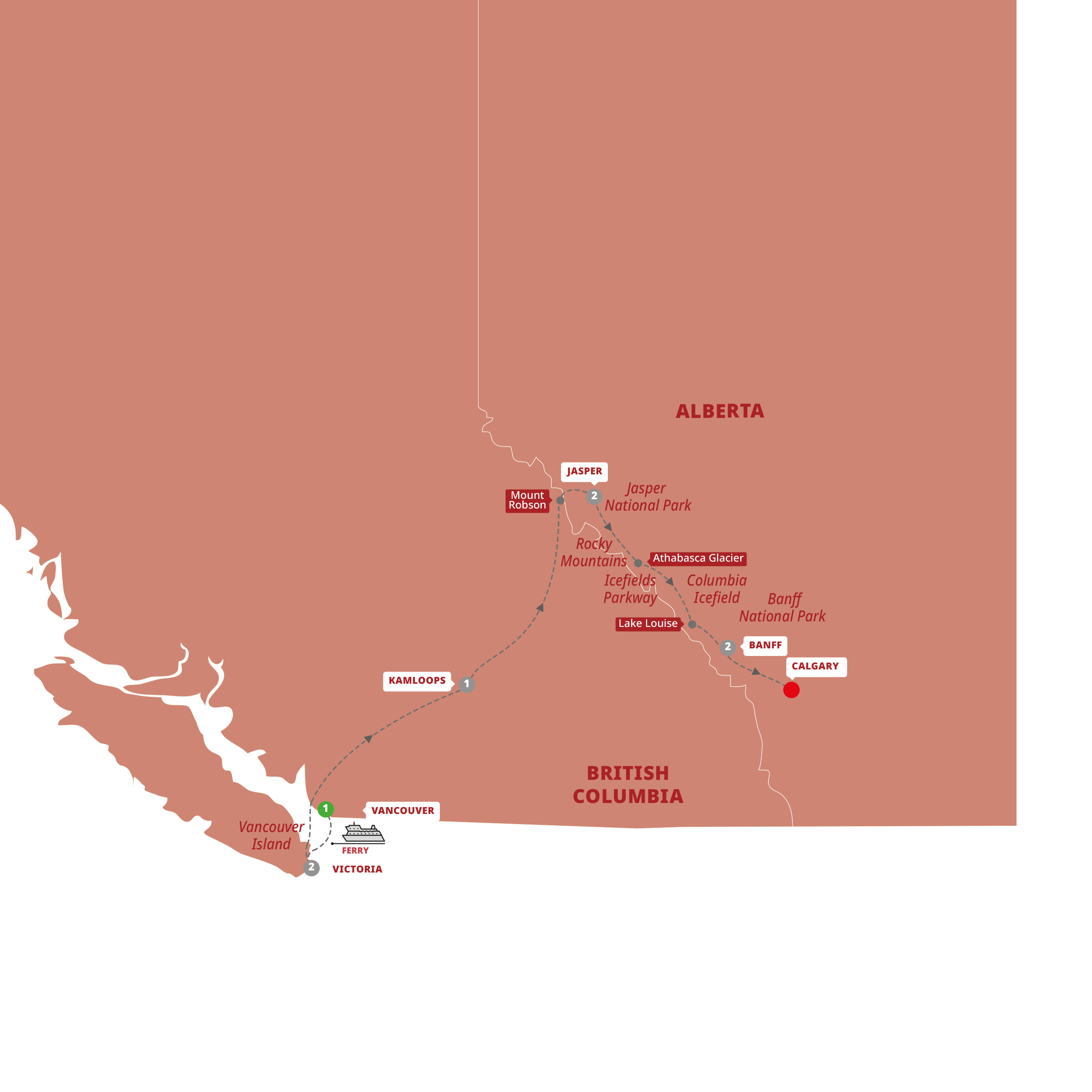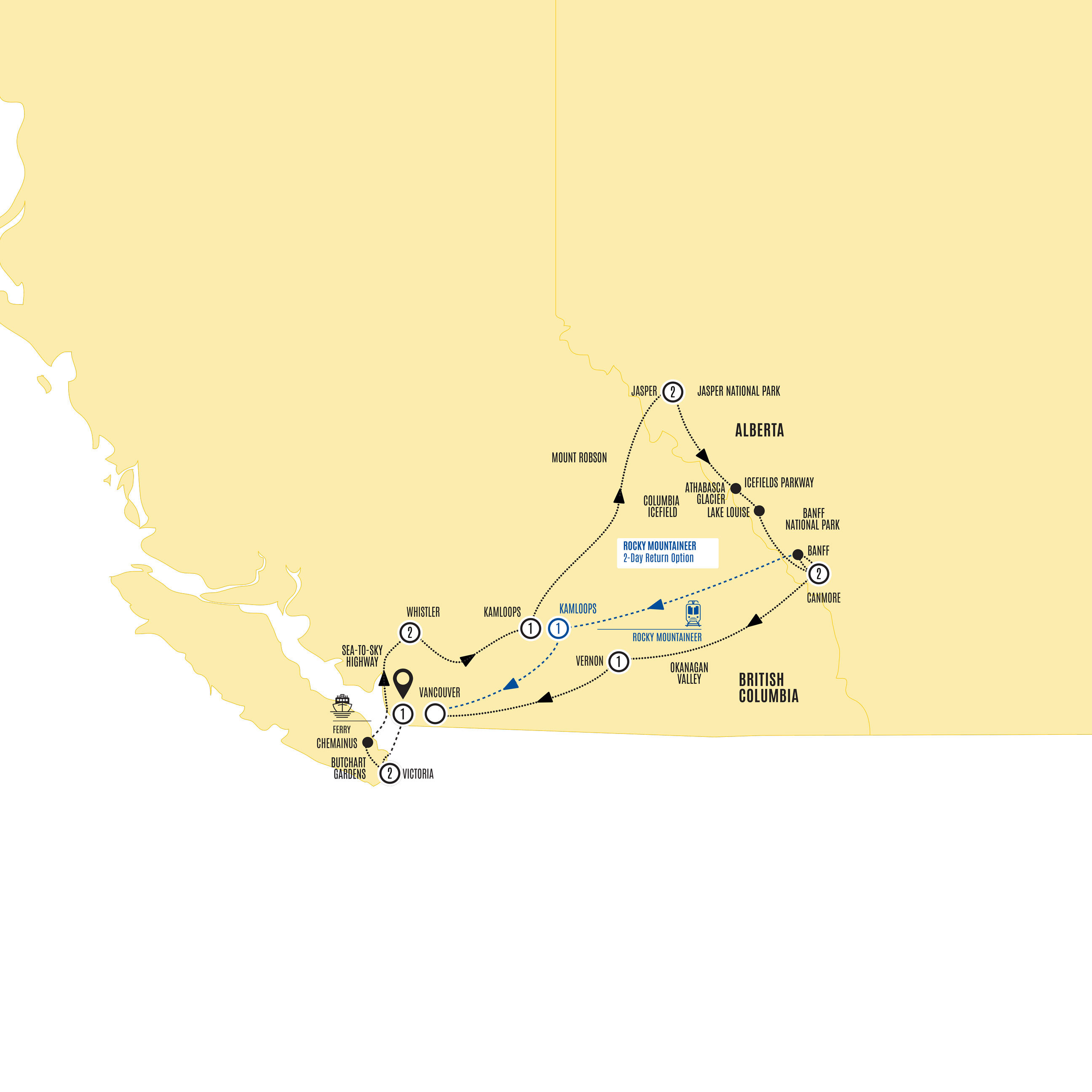 | Spirit of the Rockies with Rocky Mountaineer 2026 - 12 Day Tour from Vancouver to Vancouver  Nothing lifts your spirits like sunny days, blue skies, and even bluer water – plus soaring peaks, stunning glaciers, and sightings of local wildlife. This lofty tour of Western Canada leads you to see the inspirational sights of British Columbia and Alberta – and from a variety of vantage points. Enjoy a two-day scenic rail journey from bustling Vancouver to the still beauty of Banff National Park; cross the Columbia Icefield aboard an exciting Ice Explorer; then get ready to melt as you ferry to the “garden city” of Victoria to tiptoe through the tulips. You’ll also relish the timeless scenery of Jasper National Park and the alpine resorts of Sun Peaks and Whistler. These dream sights are complemented by the dreamiest of hotels as you rest your wonder-filled head at the best of the Fairmont Collection, including Banff Springs Hotel, Chateau Lake Louise, Jasper Park Lodge, and the Chateau Whistler Resort. PLUS, your tour includes your choice of excursions in Victoria so you can plan your day your way |