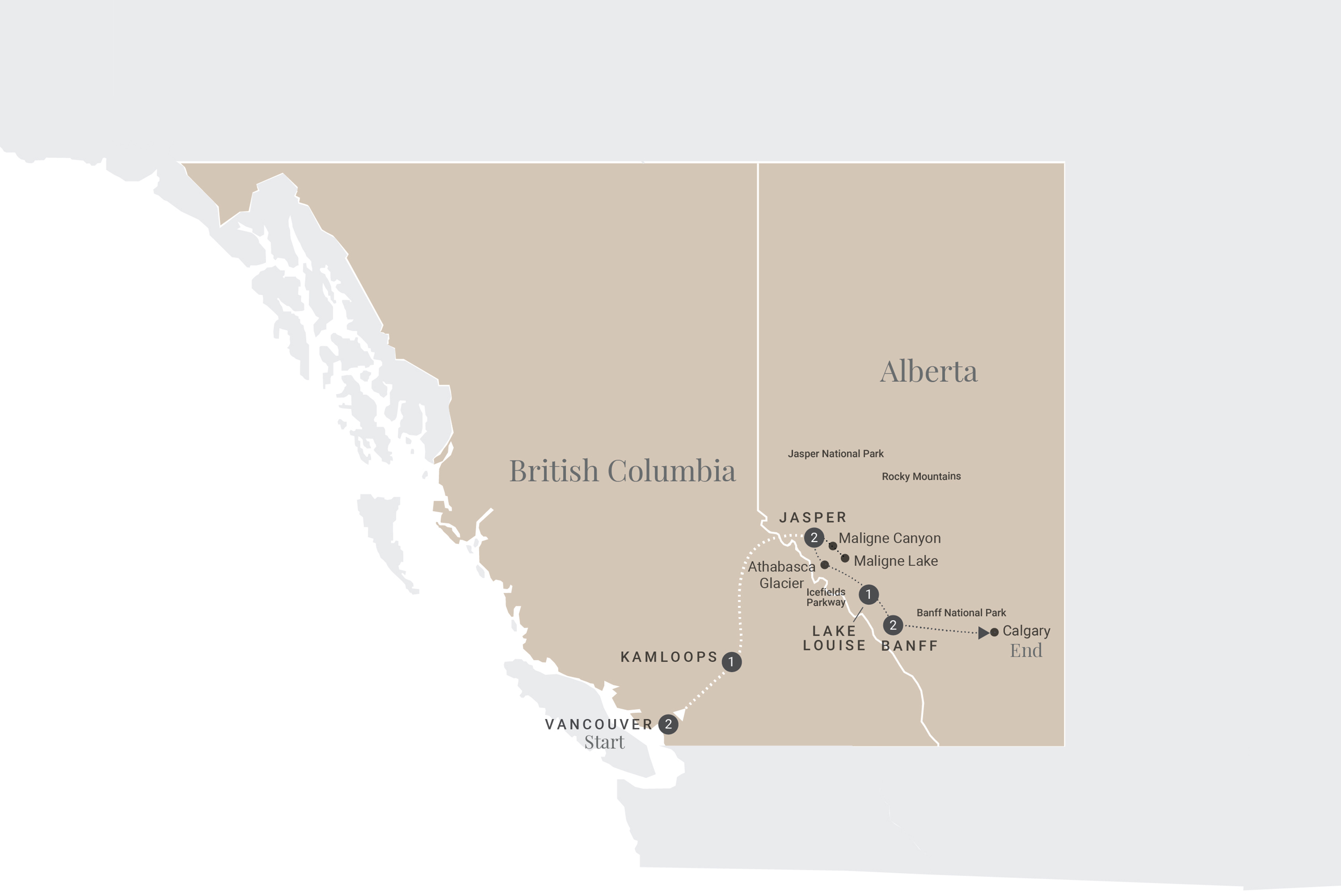 | Majestic Rockies with Rocky Mountaineer 2026 - 13 Day Tour from Vancouver to Vancouver  Feet on the ground or head in the clouds? Set your sights on both on this heady tour of the Canadian Rockies. A sunny gondola ride to Banff’s Sulphur Mountain, a private breakfast at Whistler’s Squamish Lil’wat Cultural Centre, and a special dinner inside the original greenhouse at Victoria’s lush Butchart Gardens are just some of the ways to take your travel dreams to new heights through Alberta and British Columbia. Bold and breathtaking views are served from Vancouver to Calgary on the breezes of Sun Peaks, the glacial wonder of the Columbia Icefield, the alluring blue hue of Lake Louise, and the magnificent canyons and gorges of Jasper National Park. A panoramic cruise along the crystal waters of Maligne Lake to remote Spirit Island – one of Canada’s most cherished and photographed places – elevate this journey through Western Canada. More scenery, cities, and sumptuous cuisine are served aboard your Rocky Mountaineer train as you travel in comfort from Alberta to British Columbia. A thrilling addition to your Canadian Rockies tour, your Rocky Mountaineer train transports you from beautiful Banff to vibrant Vancouver with a midway overnight stay in the welcoming town of Kamloops. PLUS, your tour includes your choice of excursions in Victoria so you can plan your day your way. |