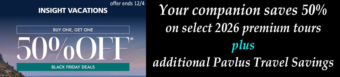 Black Friday “Buy One, Get One 50% Off”: Promotion applies when two guests are booked on the same reservation (trip/departure date). The discount is applied as an equal 25% reduction per guest. Savings are valid only on select trips featured as “Black Friday BOGO 50%”; new bookings only. Trip selection will change weekly. Full payment due at time of booking. Black Friday Deals: Save up to 15% on select 2026 departures featured as “Black Friday Deal”. Deposit due at time of booking; full payment due 120 days prior to departure, or at time of booking if within 120 days. All Black Friday Offers: Valid on new bookings only made between October 30, 2025 and December 4, 2025. Savings are valid on the land-only portion and are not valid on airfares or extra night accommodations. Savings are subject to availability and may be withdrawn at any time without notice. Minimum number of guests are required to operate departures. If guests change to another tour or date not on sale, they are responsible to pay the difference and adhere to different payment conditions; discounts are not transferrable. Deals may be combined with 5% Global Tour Rewards savings only; not combinable with other promotional offers, group discounts, custom group bookings or Future Travel Credit carry forward discount. Please note that websites