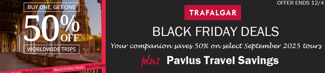All Black Friday Offers: Valid on new bookings made October 31, 2025 through December 4, 2025. Savings are subject to availability and may be withdrawn at any time without notice. Minimum number of guests are required to operate departures. If guests change to another travel style, trip or date not on sale, they are responsible to pay the difference and adhere to different payment conditions; discounts are not transferrable. Deals may be combined with the Global Tour Rewards savings only; not combinable with other promotional offers, group discounts, custom group bookings or Future Travel Credit carry forward discount. Other conditions may apply.
