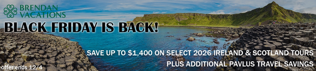 Black Friday Signature and Premium Guided Tours: Save up to $1,400 per person on select 2026 Guided Tour departures featured on BrendanVacations.com as “Black Friday Deal”. Sample savings based on Britain & Ireland Discovery departing on April 14, 2026 with a 15% Black Friday Deal discount. Deposit due at time of booking; full payment due 120 days prior to departure, or at time of booking if within 120 days.